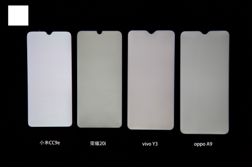 小米CC9e的AMOLED的屏幕在黑色显示更加纯粹,而其他三款手机由于均为LCD屏幕,可以明显看到背光带来的泛白泛灰的现象,而且荣耀20i还能看出明显的背光不均。
