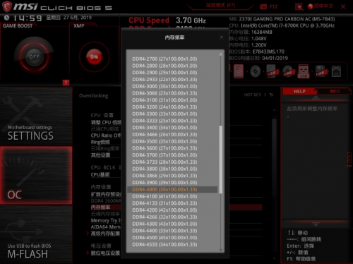 关机重新进入主板BIOS。在【内存频率】中选择想要的频率,这里我选择了4000MHz。